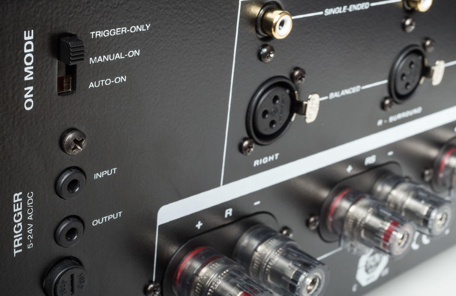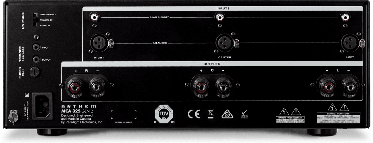 Côté connectique, l'amplificateur de puissance Anthem MCA 325 v2 met à disposition une entrée asymétrique RCA et une entrée symétrique XLR pour chacun de ses trois canaux. Il peut ainsi facilement être associé à tout pré-amplificateur. Sa mise en fonctionnement peut s'effectuer manuellement ou automatiquement grâce à son port trigger ou lorsqu'il détecte un signal sur une de ses entrées. Enfin, les borniers à vis sont compatibles avec les câbles de forte section, les fiches bananes et les fourches.