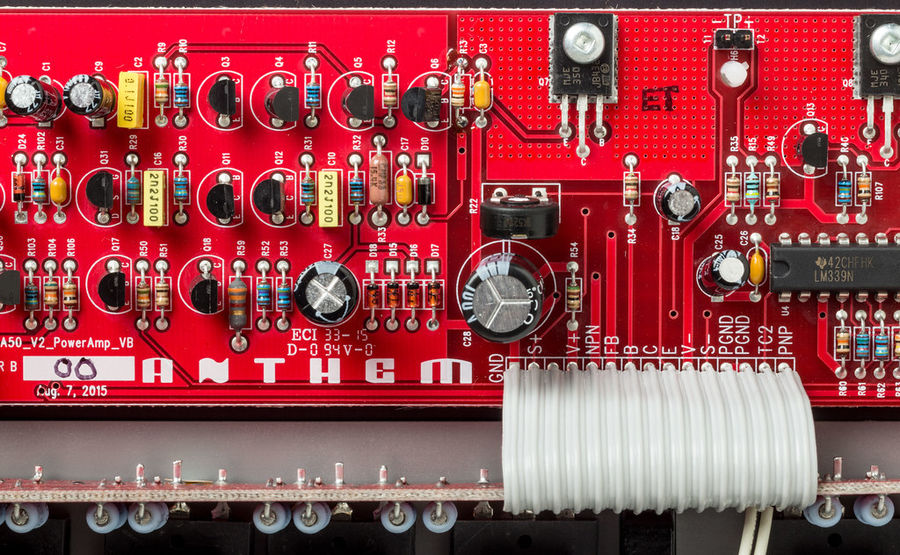 L'amplificateur de puissance Anthem MCA 325 v2 intègre des composants haut de gamme et un circuit imprimé de haute qualité. Le câblage interne est entièrement revisité pour cette seconde génération afin de privilégier des chemins encore plus courts et maximiser la préservation des micro-détails. L'utilisation de transformateurs toriques à faible flux assure de fournir un courant stable et pure à chaque composant qui est alors en mesure de fonctionner dans des conditions optimales. Chaque canal bénéficie notamment de 8 transistors, triés afin d'associer des composants aux caractéristiques rigoureusement identiques.